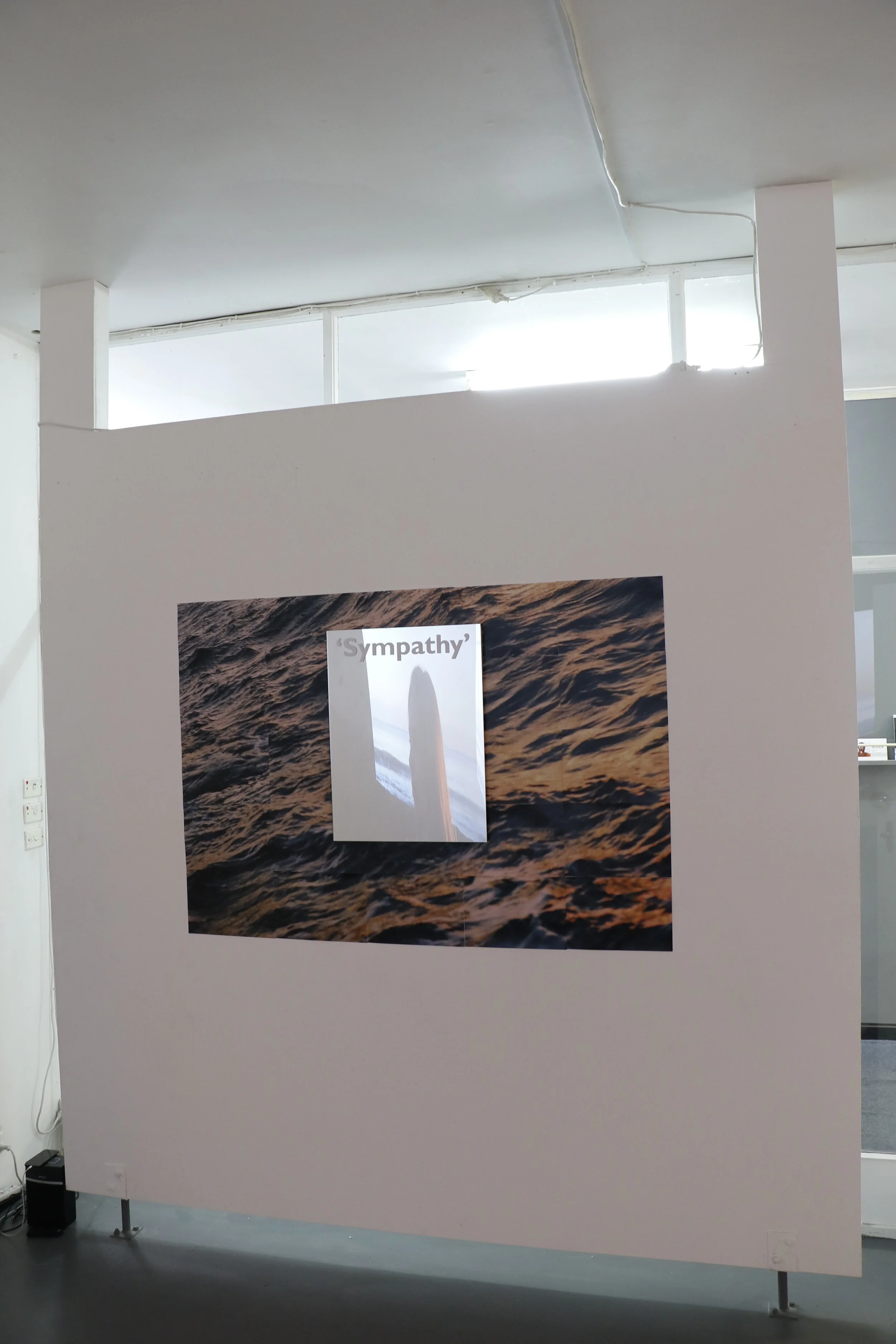This exhibition worked with the space using projections, photographic prints mirrors, text and sound. It explored the emotions and words ‘Empathy’ and ‘Sympathy’. The viewer was given these words both visually and by sound. The projection showed a video of contemplation in a place of calm and tranquillity. The prints behind the mirrors repeated this motif of the ocean and reflected back both the viewer and the projections in the space. The work allowed the audience to consider how important empathy and sympathy are to them and how these can be experienced through our encounters with one another.